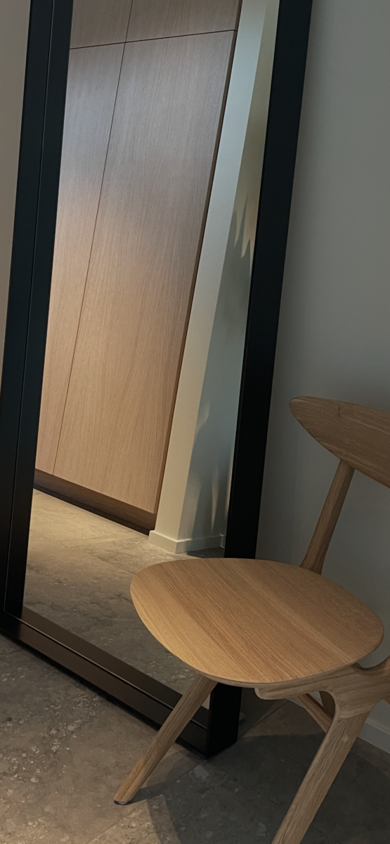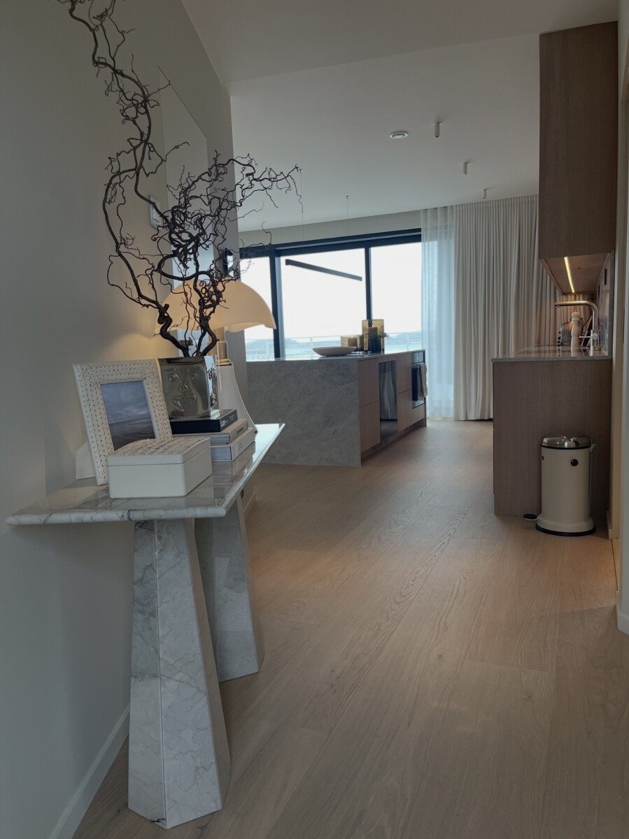 Samspel och balans mellan ljus ek, vackra sten val samt mjuka toner i övrig interiör.