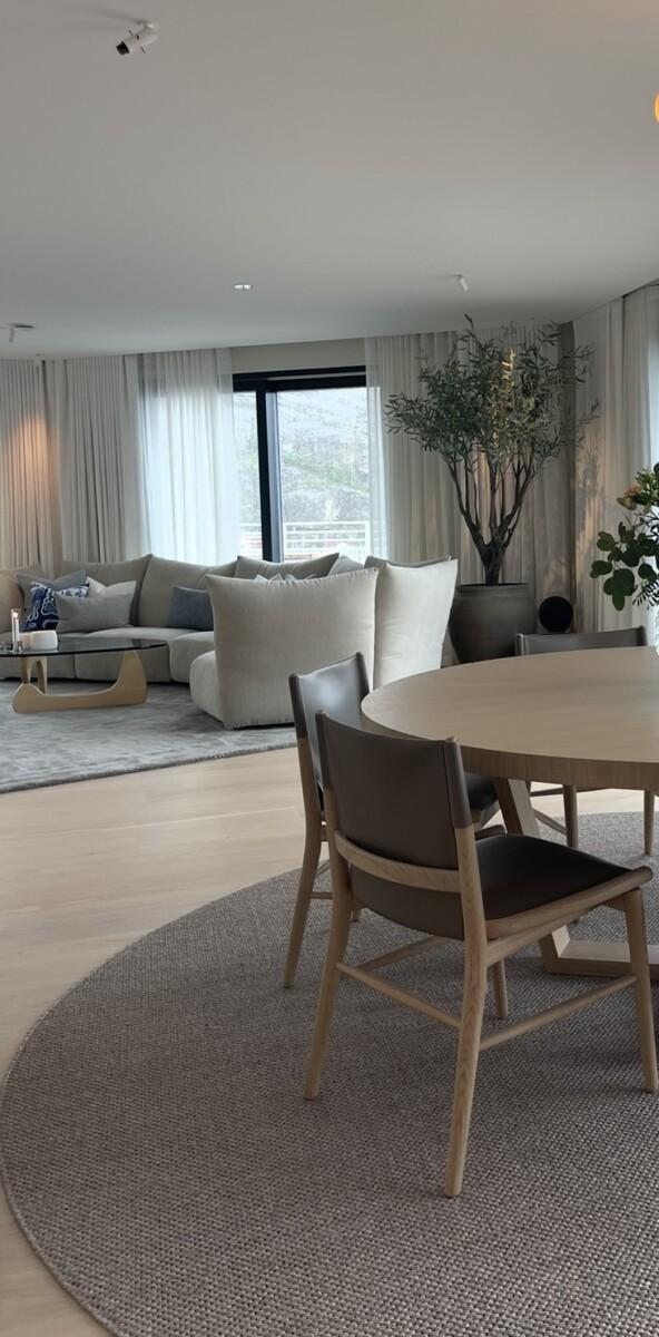 Mjuk övergång mellan mat och lounge del skapar en lugn och harmonisk helhetskänsla.