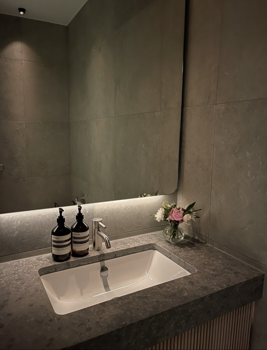 Val av stenen i hallen tillsammans med ljus ek fortsätter in i anslutande gäst badrum.